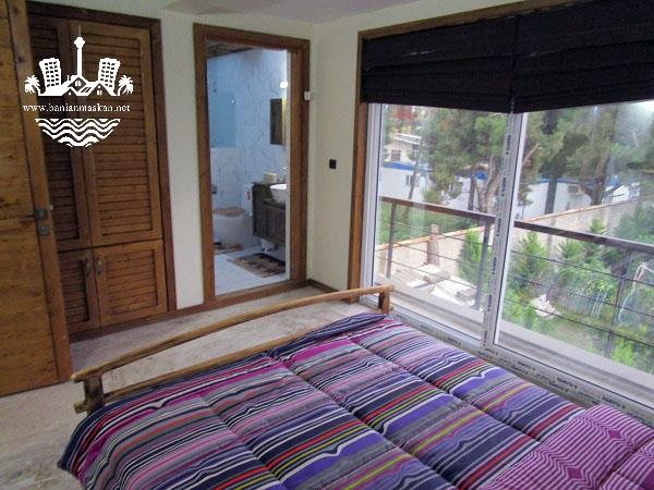 طبقه دوم : پله با اسکلت و نرده فلزی با کف چوبی وارد راهرو میشویم و 4 خواب در دو طرف راهرو که 3 خواب مستر دار با کمد دیواری و تخت خواب ها و هر خواب با 2 کمد کوچک چوبی و شیک و تمام کمد دیواری از جنس چوب دست ساز و کف خواب ها سنگ و سقف با تیر نمای چوبی ساخته شده است ، از داخل 2 خواب جنوبی ویلا دید کامل کوه و جنگل و از داخل 2 خواب با تراس شمالی و غربی دید کامل شهرک و دریا را به همراه دارد .